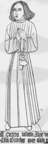 William Curteys and wife (both died on same day in 1499). He was a notary and from his belt hangs a pencase with ink horn.