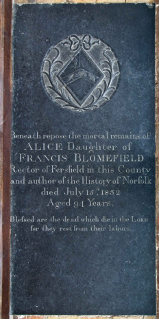 Memorials to Alice, the daughter of Francis Blomfield, author of the History of Norfolk can be seen on the wall and floor of the south aisle.