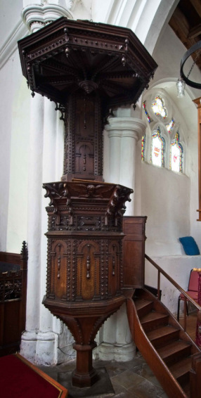 The Jacobean Pulpit, is complete with tester and and backboards and is dated 1636. There is a decorated style piscina, which was used to wash the communion vessels, behind the organ close by.