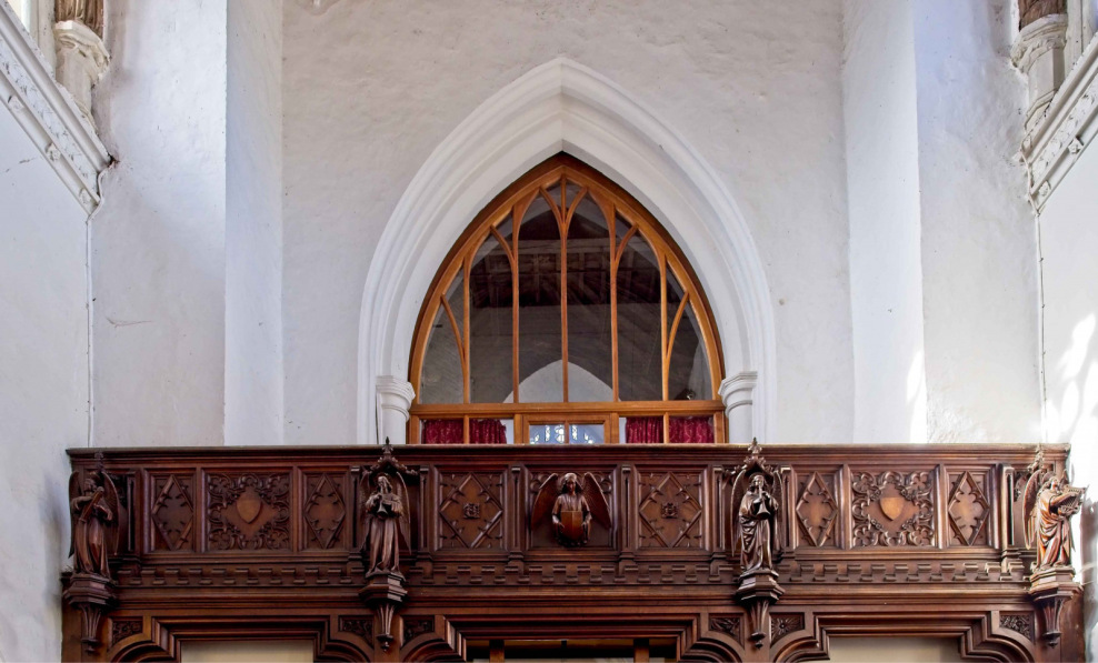 The West Gallery was made to fit the new tower in 1865 and is decorated with figures playing musical instruments. Square stones in the nave floor indicate where pillars stood to support the former minstrel's gallery.