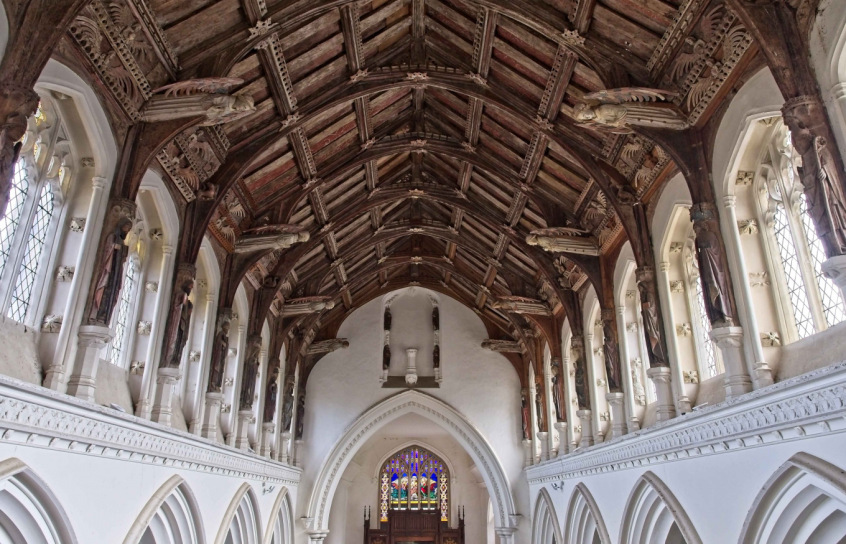 The Nave was re-constructed just before 1490 raising the height of the nave by fourteen feet, inserting a magnificent clerestory of eight sets of perpendicular windows on each side, and building a carved oak and chestnut hammer-beam roof.