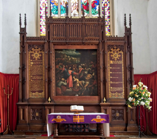 The Communion Table is Jacobean and is inscribed 'T.M. 1634' when it was donated by one of the Mason family. The reredos includes a large painting, a copy of the famous 'The Raising of Lazarus' by Sebastiano Del Piombo. In a crowded scene it depicts the arrival of Christ and Lazarus struggling with his grave cloths. The reredos is flanged by Commandment Boards.